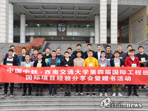 4月2日下午三点, 中国中铁国际工程班国际项目经验分享会暨赠书活动在犀浦校区X9303举行。出席本次活动的领导有:中铁二局国际部商务合同科科长胡伟,中铁亚欧阿斯塔纳轻轨指挥部办公室主任幸代泗,中铁二局人力资源部唐梓淇,中铁二局人力资源部祝军以及中国中铁第四届国际工程人才班的部分学员。性吧