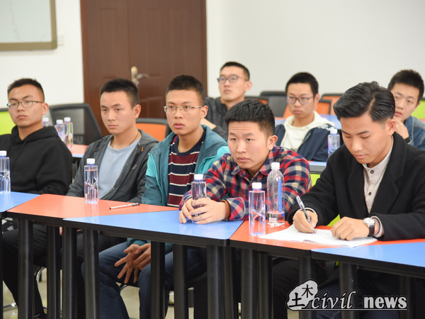 随后,辛代泗老师分享了自己的三点感想。第一,学会感恩。通过回忆自己从学生到在中铁二局工作这十六年的人生历程,他对同学们提出了感恩时代、感恩父母的要求。第二,认真工作,做一个不拼爹,靠自己的人。第三,吃苦耐劳。他强调到,独自在海外打拼必然要面临身心的挑战,国际工程班的同学们要以吃苦耐劳的品质迎接挑战。辛老师的一番话让在座的同学们受益匪浅。