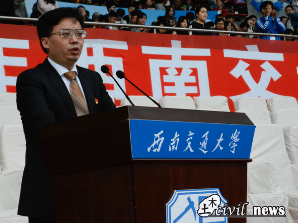 待入场完毕,各个方阵在田径场上排列整齐后,国旗方阵缓缓走向主席台,国歌声响起,全体人员起立注视国旗,奏唱国歌。接着由徐飞教授为开幕式致辞。致辞中,徐飞教授向运动会的隆重召开表示隆重的祝贺、向刻苦训练、积极参赛的运动员致以亲切的问候、向参与运动会筹备组织工作的全体师生表示最由衷的感谢。希望各位运动员将竢实扬华、自强不息的精神融入本次运动会中,通过本次运动会将我校学子追求坚持不懈、勇攀高峰的精神展现出来。同时也强调了体育锻炼的重要性,号召西南交大的每个学子积极参与体育锻炼,表达了对此次参赛运动员的美好祝愿。