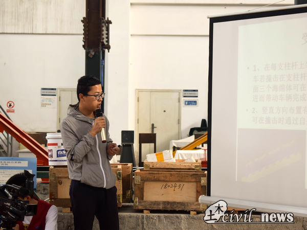本次比赛是以设计高速公路防护栏来达到公路安全性和美观性作为选题背景。比赛时,每个小组兵分两路,一边进行加载,检验防护栏的实用性,一边进行ppt答辩。加载过程中,小车从斜坡上冲下,以30度斜角撞击防护栏中部。每组只能撞击一次,结束后,由工作人员记录撞击后护栏最大变形量、护栏总重量及撞击后车辆停放的位置。在这个阶段中,有些小组在撞击过程中防护栏变形不明显,小车方向也没有发生较大变化。而还有一部分小组,模型撞击时出现了防护栏结构被破坏,小车翻出公路等等的问题。另一边,在进行ppt答辩时,小组需在限定的3分钟以内完成介绍。值得一提的是,有的小组通过用英文答辩的方式来使队伍获得加分。