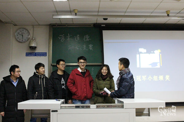 接着,为了帮助同学们树立道德意识,进行了学术道德竞赛活动。活动形式是将全班同学分为六个小组,进行三轮问答,分别是必答题、抢答题、风险题,由主持人进行提问,答对的小组可以加分,并获得奖励。在紧张的氛围中开始了必答题环节,在这一轮中,第二小组先下一城,在抢答题环节中气氛达到高潮,同学们踊跃举手,积极抢答,第三小组反超取得领先,最后一轮风险题,同学们热情不减,在激烈的竞争中,第三小组获得最终胜利。同学们在竞赛中,收获了知识,促进了交流,受益匪浅。