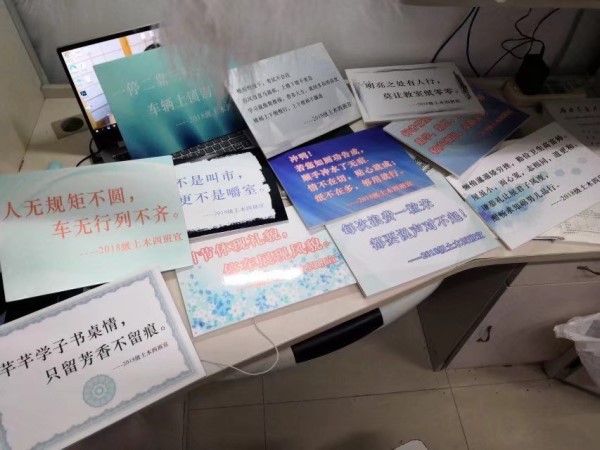 于是,在十八日下午,在本班团支书的带领下,同学们拿着标语,在教室墙上、楼梯瓷砖上、车库、卫生间等较为醒目的地方进行标语张贴。“人无规矩不圆,车无行列不齐”、“教室不是叫市,更不是嚼室”、“谦恭礼让展君子风度,酣畅求知砺男儿品行”、“芊芊学子书桌情,只留芳香不留痕”、“屋虽小,而心宽;志相同,道更合”等虽短小但却包含指导同学们日常行为规范的道理的特色标语表达了四班同学对广大同学行为文明的美好期待,也表达了我班同学对校园文明风气蔚然成风的无限憧憬。
