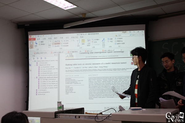 随后,剩余4个小组也分别展示了自己对于搜集到的SCI优秀论文的理解。第二组的题目为《成层土中地下水渗流对盾构隧道开挖面稳定影响上限分析》,第三组的题目为《山岭隧道模型抗震措施振动台试验研究》,第四组的题目为《隧道信息建模框架,用于支持机械化工程中的管理,模拟和可视化》,第五组的题目为《采用矩形双轨道横断面盾构机区间隧道与跨线隧道的统一施工》。四篇论文均为各个小组从不同方向收集到的具有代表性的文章,包含土的特性、山岭隧道、BIM、盾构隧道等多方面的专业知识。小组成员们从选题思路、创新性等方面展示了对这些高水平论文的理解。
