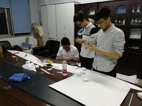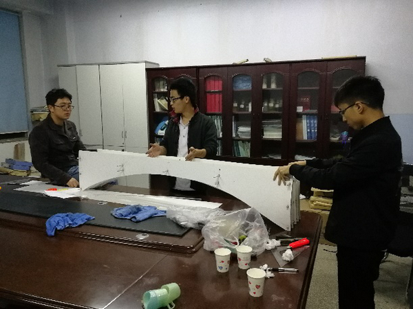 在解决问题的过程,我们不断翻阅书籍、查找论文、请教他人,提升了自己的知识检索能力。同时,针对一个个的具体问题,我们互相探讨、不断论证,团结一心,组织合作愈加默契。设计一个全新的结构,我们不单单得借鉴前人经验,还得考证我们所设计的新式结构是否符合结构设计规律、能否运用于实践操作。不得不说,我们在这一个个的过程中得到了成长。队员们没有太多设计经验,我们就花别人三到五倍的时间去研究讨论设计流程和技术规范;队员中没有桥梁专业的同学,对于结构认知度不高,我们就自学专业书籍后认真求教桥梁专业知识储备较好的同学;我们几个大男生手工能力差,我们就自费多买一些材料来操作练习,丝毫不怕花费多少精力和时间。在完成比赛的过程中,我们同时还得上课和完成团队科研工作,但这并不影响我们的热情,队员们利用晚上空闲的时间集合到一处,常常做到晚上十一点半,如果有个别队员有空,也会主动的去自行做一些小构件,尽可能的保证速度和质量。这样的日子,我们持续了一个月,累并快乐着。