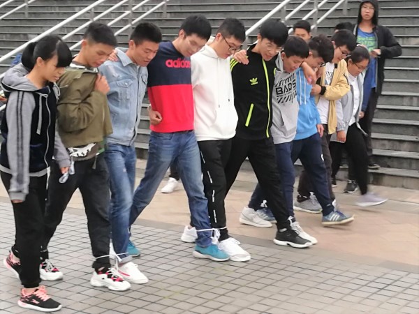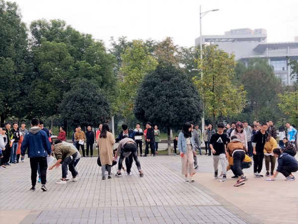 最后,我们的终极大戏——十人九足,终于要开始啦!10个人如何用11条腿从起点快速走到终点呢?来,我们的部员为你揭秘。将每个队的队员的腿都系在一起之后,我们给7个队5分钟的练习时间。经过5分钟的练习后,大家不约而同地采取喊口号的方式来统一大家的步伐。正式比赛开始了,现场气氛十分紧张,随着裁判员一声令下,大家犹如离弦的箭,向终点冲去。伴随着快速整齐的步伐,各个队员口中的“一,二;一,二”响彻交大校园。