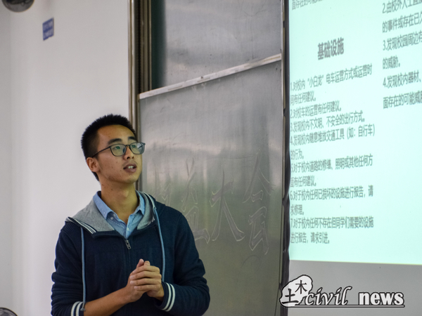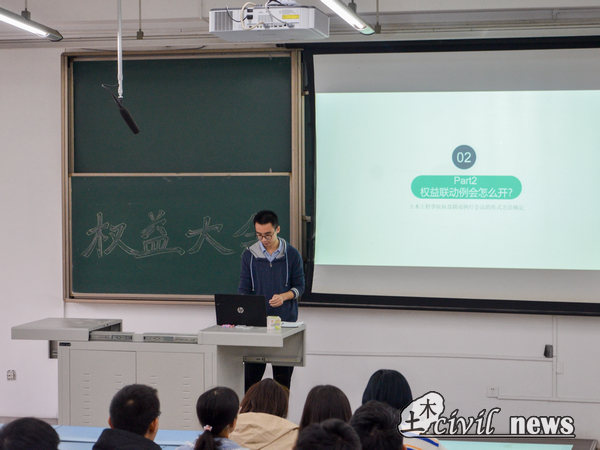 随后,针对如何运用青年之声平台这一问题,主讲人伍同学对线上线下两个部分进行了详细介绍。线上即通过西南交大土木news君这一微信公众号进行问题的反馈;线下即向权益委员反映,其再通过每两周召开一次的权益大会来将反映的问题集中上报给相关权益负责人。在主讲人简洁明了的讲解下,在场的同学们对这一平台的运用有了更进一步的认识。
