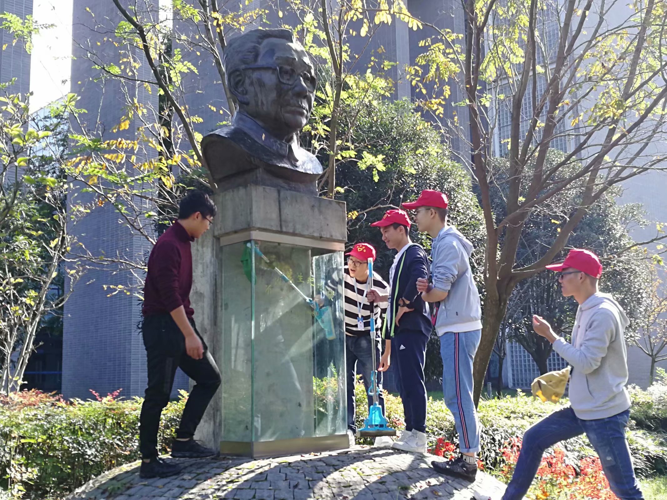 犀浦校区包括林同炎先生在内的雕塑和纪念碑。提桶打水,搬运工具,洗涤抹布,擦拭雕像,志愿者们细心的清洁了每一个细节,整个过程行云流水,传承着历史精神的雕塑在志愿者们的努力下再次变得清洁明亮。