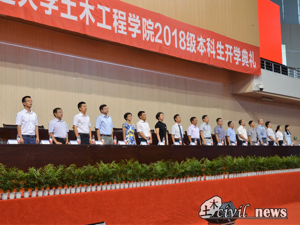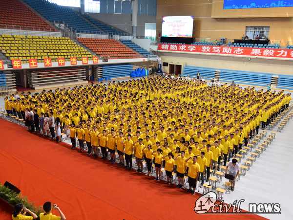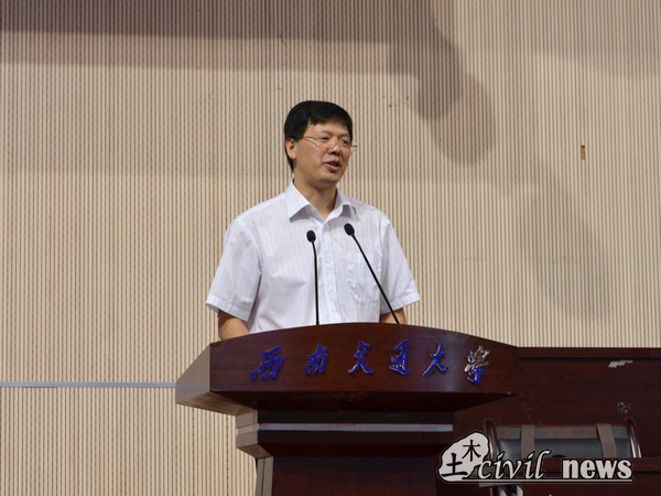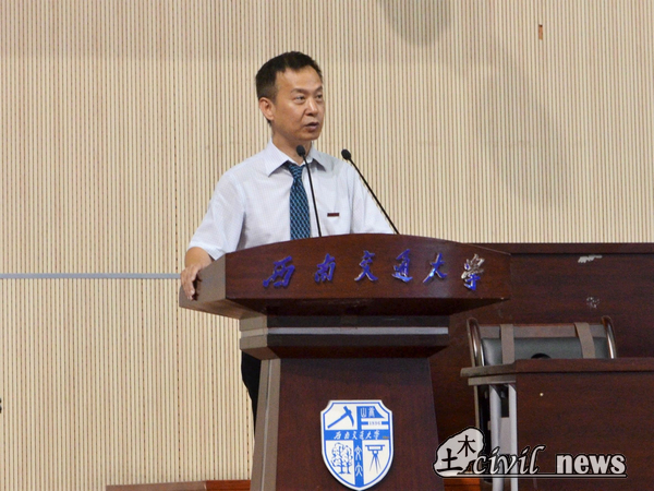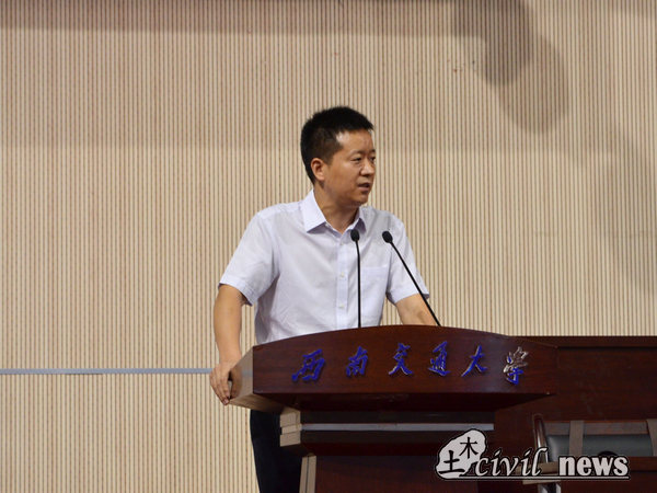 礼毕,议程进行第二项,由蒲黔辉院长致辞。蒲院长首先表达了对同学们的欢迎,而后又给新生们简单介绍了学院的雄厚的师资力量、学院现状以及未来计划。在谈到我校土木成就以及学校各大实验室时,蒲院长骄傲地说:“我校土木的硬件设施绝对在全国是名列前茅的。”于新生,蒲院长提出两点希望,第一点是仰望星空,自成高远,选择了交大,就是选择了担当,选择了土木就是选择了沉甸甸的责任,希望同学们成为有抱负、敢担当的大学生,第二,脚踏实地,不忘初心。希望同学们未来四年有一个成年人的责任与判断力,牢记自己的使命、不负父母与教师的期盼。年轻人要学会选择,为终生的全面发展奠定基础。最后,蒲院长也祝愿大家学业有成,也祝愿新生家长朋友们身体健康,工作顺利。