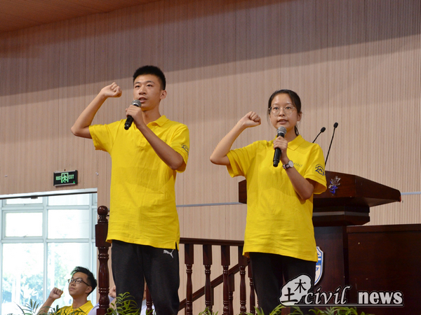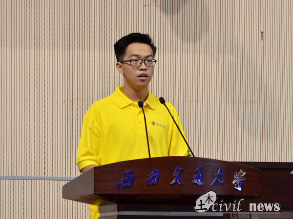 接下来大会进入第五项,由来自三班的新生代表刘明峰同学发言。他向大家诉说了自己与西南交大与土木学院的缘分:父亲是一名工程制图工作者,从小受到父亲工作的熏陶,参加学校桥梁模型比赛时与父亲的共同制作让他坚定了土木的信念,在七月志愿填报时,在成功拿到录取通知书时,这颗经历十余年积淀的种子,向着他最爱的地方,生根发芽。随后刘明峰同学向大家提出了三点倡议:第一学会自律,步入大学就是慢慢与社会接轨,面对未来的种种挑战,唯有自律从小事做起,约束自己的言行举止,制定学习计划才能让大学生活变得十分美好。第二学会主动,脱离了被迫学习的方式,而现在主动学习是最新方式。第三学会承担,诚如梁启超先生的《少年中国说》,我们已经步入成年,承己责任,不负韶华。最后刘明峰同学祝愿大家在大学生涯中都能收获成长。