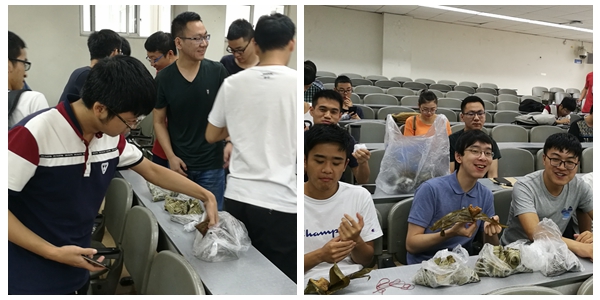 在进行完“期末复习动员大会”后,由支部书记张振华组织进行“庆祝端午活动”。班级委员们考虑到南北方的饮食习惯的不同,提前准备好了各种口味的粽子,并供班内同学享用,同学们的愉悦心情溢于言表。