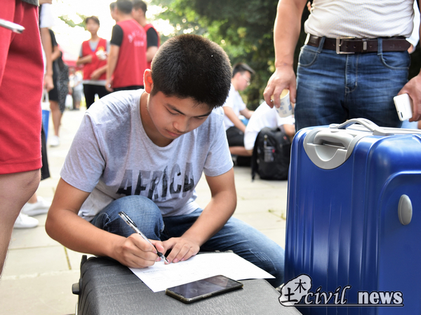 天佑斋17号楼是男生居住的地方,与其他新生不同,默默打扫着地面的刘同学并没有父母的陪伴,他一个人拖着行李箱,独立完成了报道手续。记者了解到,他是从湖南一个人乘火车来学校的。“以前上学我是自己一个人去,这次我也可以一个人来大学。再说,其实我并不是一个人,我有好多湖南老乡学长学姐的帮忙,虽然离家很远,都是我却依然能感觉到家的温暖。”谈到自己的专业,他说,父亲和哥哥都从事土木工程这一方向,于是他从小就立志成为一名土木人,能在性吧