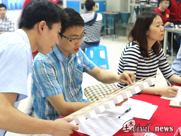 有的组在第一个实验的时候失败了,工作人员会给他们3分钟的调试时间,一旁的指导老师也会过来帮助选手们进行调试。两次实验都成功的组进行侧向转换——换轨,然后开始侧向顺向溜放试验和侧向逆向溜放试验。最后进行动载沉降试验,这个试验测试小车顶面下沉量,以此代表整个结构的变形稳定性。做完所有的试验后,评委老师们会对选手们制作的模型进行评分,同时选手们也会在答辩区对自己组制作的模型进行陈述。老师们表示,看到学生们做的模型能够试验成功,他们也感到十分开心。