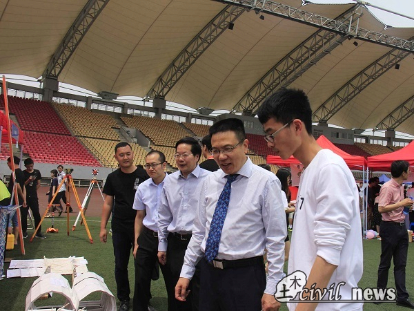 中午12点左右,校长徐飞、党委常委沈火明以及团委书记廖军来到了嘉年华现场。科创的同学为领导们介绍了场地中的作品,徐飞校长对土木学院的作品以及现场的工作表示了肯定。