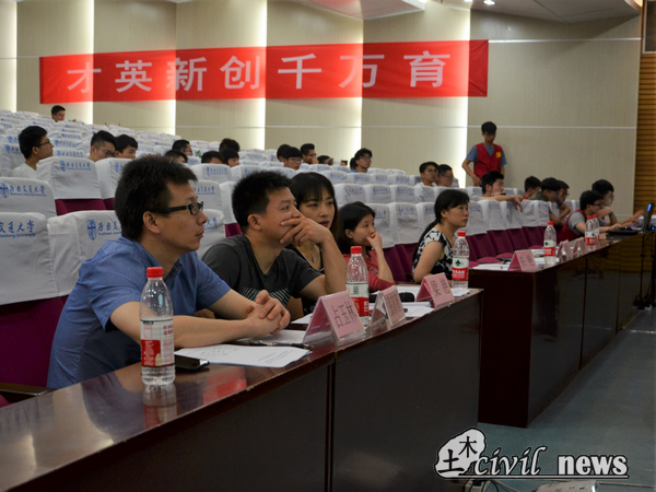 第一排是评委席,到场的评委有研究桥梁领域的易虹岚老师, 主要从事车辆—桥梁耦合振动的朱艳老师,桥梁美学领域的梁艳老师,以及主要研究大跨度桥梁结构行为的占玉林副教授。决赛正式开始前,科创中心的工作人员以投影的方式放映了赛题背景和作品的展示。二到六排是选手席,大部分选手都已就坐,六排以后则是观众席。