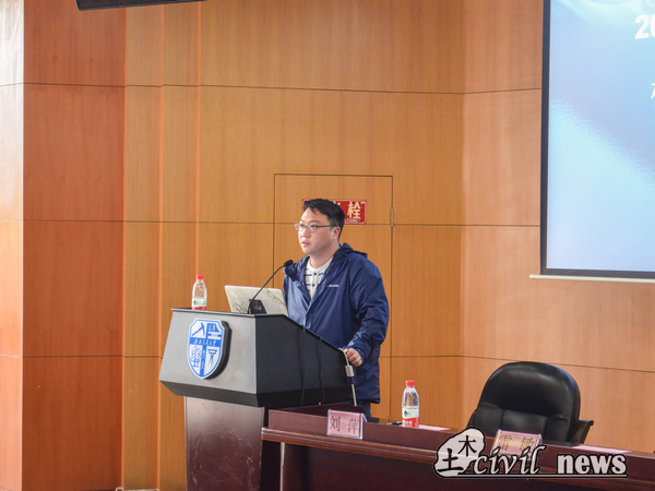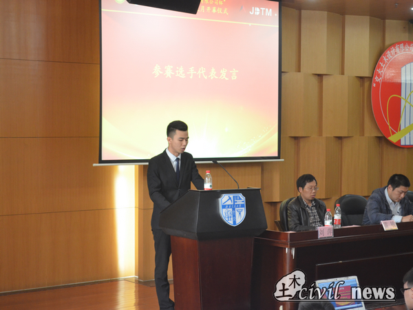 参赛选手代表2015级邓宇航同学随后上台发言,他向大家分享了自己两次参加土木科技月过程中的苦与乐,他说“唯有亲身经历过才能体会到土木科技月的魅力”,字字句句中流露出对土木科技月赛事的深厚感情。随后性吧