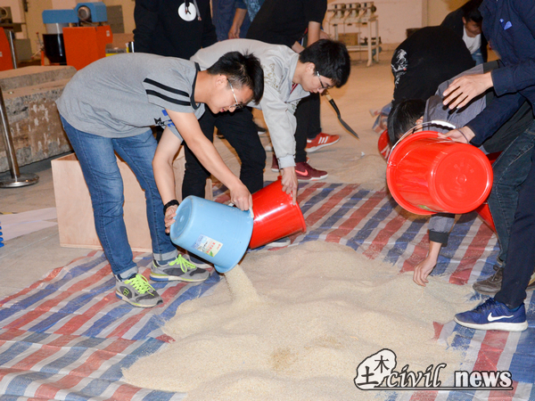 比赛中用到的沙,是他们一袋袋搬运至加载处,用铲子一点点堆砌好,方便选手加载模型,保证比赛的有效性。