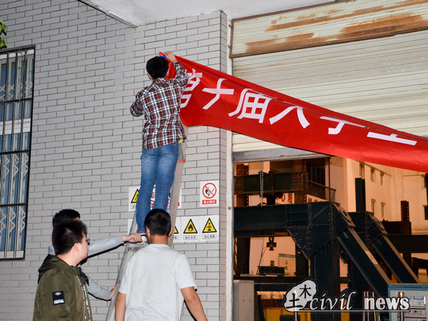 他们将比赛的签到处、模型制作区、称重处、模型放置区、加载等候区、加载区、答辩区分划整齐,以最合适的路线布置赛场,使选手一目了然。而比赛的横幅,也是经过认真的考虑,选取最合适的方位,贴在最醒目的位置,昭示着比赛精神。