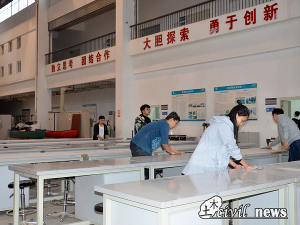 接着,他们将答辩区教室和模型放置区教室打扫干净,保证仪器的有效和评委老师的顺利评判,即使教室里尘土飞扬,他们也认真打扫,毫不懈怠。
