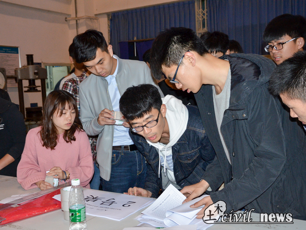之后是指引选手提交模型,并放入对应组号,并为每一件模型拍摄照片。进入加载阶段,他们站在加载箱边,为选手说明注意事项,帮助记录比赛成绩。加载结束时,他们帮助选手将沙重新放回沙堆中,周而复始,一件模型的加载需要漫长的三十分钟。加载现场,由于沙石缘故,空气中弥漫着粉尘,但他们依旧各司其职,全神贯注,监督选手们的比赛过程。在答辩过程中,他们连接着选手与评委的沟通与交流,在ppt放映过程中,他们全情投入,严格控制答辩时间和答辩顺序。