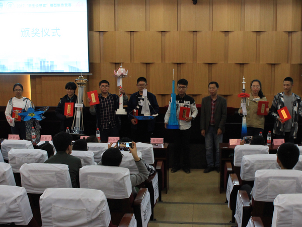 在主持人简短的介绍了赛制规则及比赛主题后,各组代表依次按组号顺序携带模型上台进行不超过两分钟的答辩并接受评审老师的提问。其中最令人印象深刻的莫过于一个塔身镂空水晶质感塔顶的一个作品,此作品塔身镂空雕花,塔内接有小灯,在现场闪烁,暖黄色的灯光从喷成金属色塔身的间隙以及水晶质感的塔顶中露出,在简要介绍后,评委提问环节时六位评委也没有做出提问,只是赞叹不已,可见此作品制作的精细程度以及评委的满意程度。在38组选手依次进行了答辩了之后,科创中心的工作人员进行了统计,全场人员都在等待着最后结果的到来。