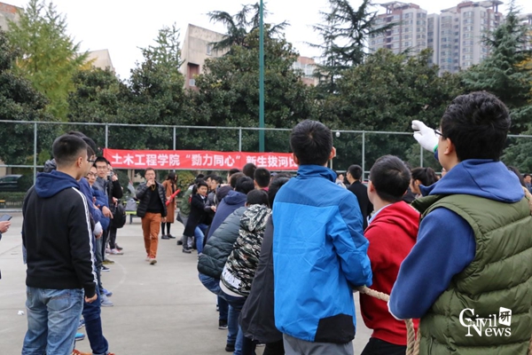 本次比赛为综合考虑赛程安排及比赛公平性,采用“淘汰赛”的赛制,比赛规则为每班派出男生12人,女生1人进行参赛,最后绳子倾向哪边的长度超出规定长度哪边就获胜。今天是比赛首日,一共进行了9场比赛。比赛分为两个时间点进行:12:30及13:00。尽管天气有些寒冷,但前来助威加油的人仍不在少数,使赛场气氛十分热烈。比赛前15分钟,所有的参赛队员均已到达赛场并完成签到任务,他们跃跃欲试,紧张而又兴奋地期待着比赛的开始。