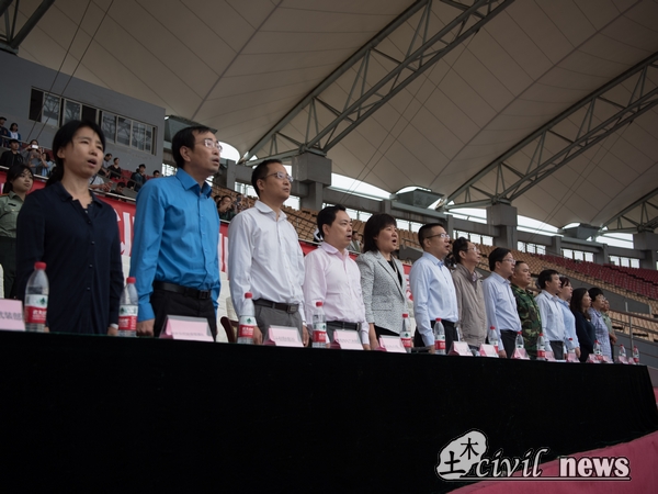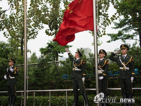 在简短介绍了到场嘉宾后,典礼正式开始。全体面向国旗,升国旗,奏唱国歌。