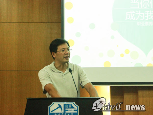 9月20日下午两点半,在图书馆二号报告厅举行了题为“当你们成为我们”的关于职业素质与职业规划的讲座。本次讲座的主讲人为中国建筑一局有限公司人力资源部副总经理张昊,主持人为土木学院党委副书记李锦红,邀请的嘉宾有2014级辅导员黄雪娇,2016级辅导员巨云华以及中建一局子公司的部长和经理们。