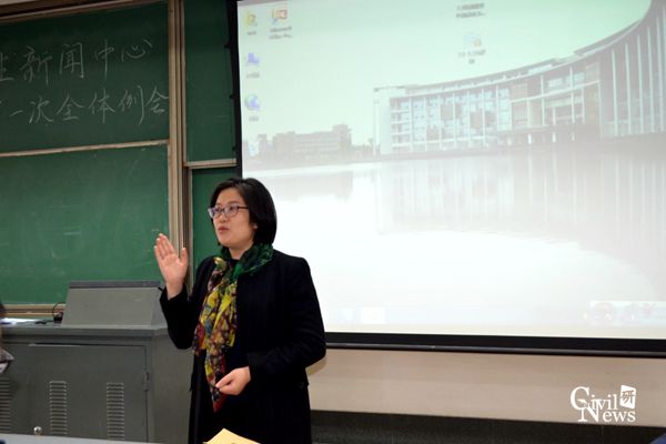 随后,商姚老师发表讲话,首先,她对上一届新闻工作者的辛勤付出给与了肯定和表扬;然后,商姚老师详细分享了自己的新闻工作经验,第一:新闻工作者要做到“脚勤”、“手勤”和“脑勤”,现场采访记者和摄影记者要做到“脚勤”,接到任务通知尽量第一时间赶到现场,文字记者要做到“手勤”,才能写出精炼的文字;编辑人员和美工人员要做到“脑勤”,才能编排出赏心悦目的新闻稿;第二:做好团队文化建设,营造良好工作氛围,工作人员要做到有需必到,编稿质量高,投稿时间快;第三:提高解决问题的能力,处理事情要懂得灵活变通,达到精益求精。最后,商姚老师还提出了一些在新闻工作及新媒体运营中的注意事项。