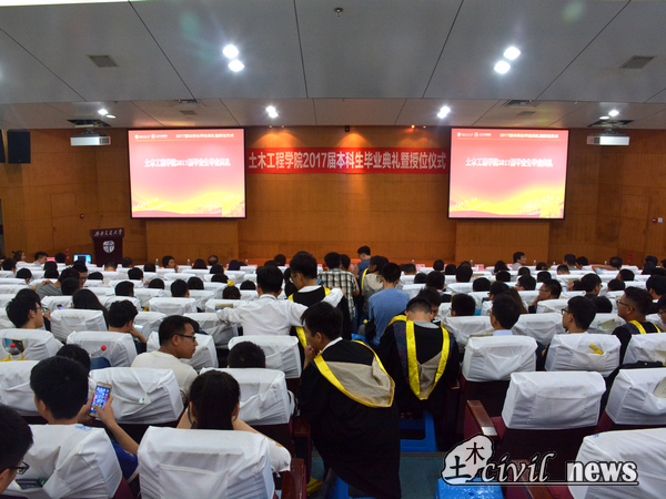 2017届本科生毕业及授位决定》。她提到,土木工程的毕业生掌握了土木学科的基本技能,具有宽厚的理论基础,广泛的专业知识,较强的实验能力和一定的实践精神。毕业生们顺利完成了本科阶段的教学任务,被授予土木工程工学学士学位。富海鹰教授代表学院向全体2017届毕业生表示祝贺,希望在场毕业生能继续前进,奔赴祖国各地,建设大好河山。