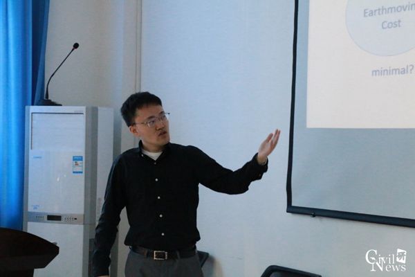 报告的第一阶段,易超绝博士简要介绍了他目前主要研究的两个方向:(1)建模和模拟施工作业;(2)开发项目规划、控制和可视化领域的创新方法和技术。随后,从实际工程案例出发,介绍了临时运输道路布局设计的优化方法,该方法以降低土方总成本为目标,在一系列相关问题基础上,有针对性地建立了与切割平面方法集成的混合整数线性规划模型,并开发了相关的仿真模型在优化土方资源整合过程中的作用,该方法可以充分确保所制定解决方案的实际可行性。报告的第二阶段,易博士代表其所在的课题组为与会学生介绍了如何申请加拿大阿尔伯塔大学工程建造与管理方向博士研究生资格以及全额奖学金要求等。