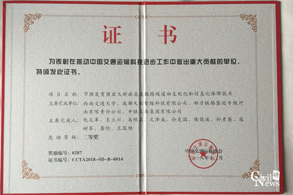 2018年1月5日,中国交通运输协会科学技术奖(奖励编号0287)在北京泰山饭店举行颁奖仪式,该奖项经国家科学技术奖励工作办公室批准设立,今年参加评审的项目超过400项,经过初评、复评、答辩和公示等环节,最终获批171项科学技术奖,其中一等奖24项,二等奖56项,三等奖91项。