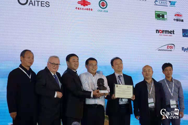 仇文革教授代表蒙华铁路白城盾构隧道项目组进行了申报演讲,经评委会投票,“采用大断面马蹄形的土压平衡盾构方法首次应用于黄土山岭隧道”从众多竞逐项目中脱颖而出,获得了国际隧道界17位专家的高度认可,荣获“国际隧道协会2018年度技术创新项目奖”。