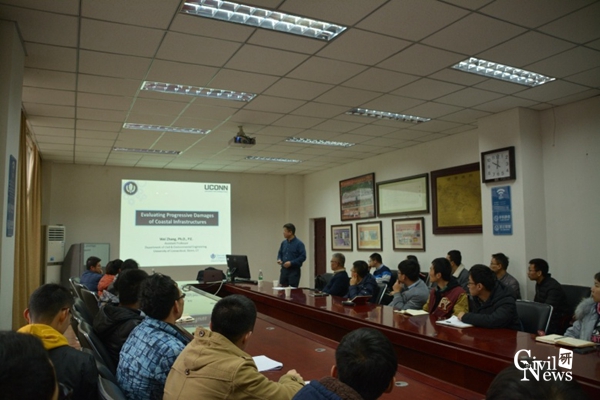 应桥梁工程系邀请,美国康涅狄格大学张伟副教授到访我校。12月19日上午,张伟博士在九里校区土木馆1324会议室带来了一场题为“沿海结构时变损伤评估(Evaluating Progressive Damages of Coastal Infrastructures)”的精彩学术报告。本次讲座由桥梁工程系李亚东教授主持,桥梁系多位老师、研究生聆听了报告,参与了交流。