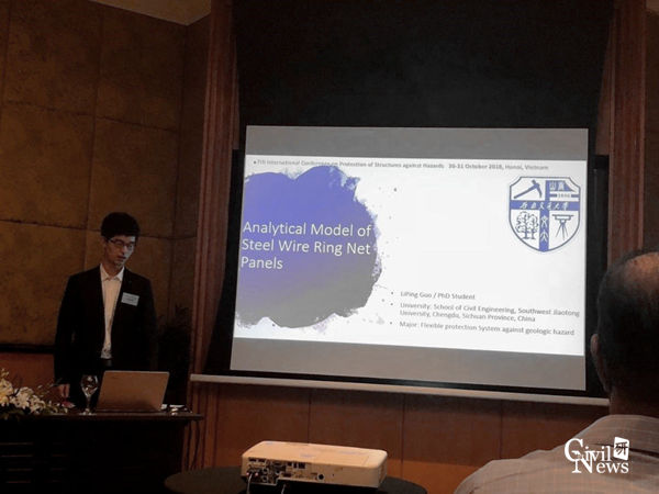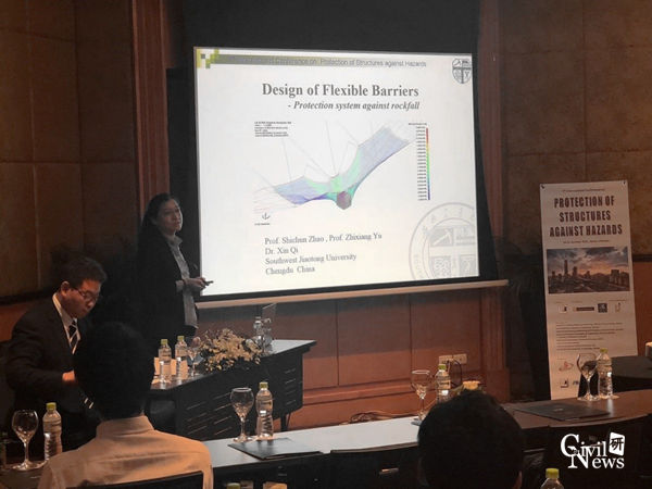 防护结构研究中心齐欣老师介绍了我校近年来在柔性防护结构设计理论研究方面取得的研究成果“Design of Flexible Barriers- Protection system against rockfall”;防护结构研究中心郭立平博士生就柔性拦截网片的解析力学模型构建 “Analytical method for out-of-plane mechanical behavior of steel wire ring net panels”做了分会场报告。