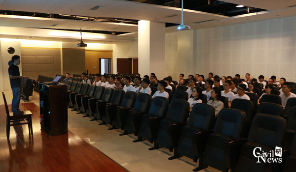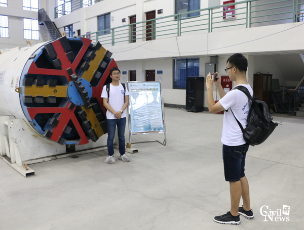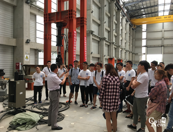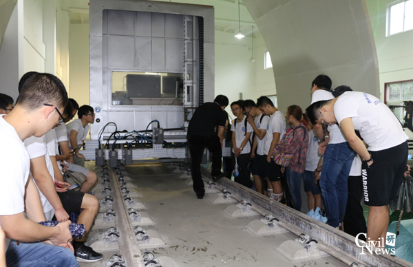 全国优秀大学生夏令营全体营员准时在土木馆门口集合,在老师带领下,顶着如柱大雨,有序前往教育部交通隧道实验室参观。到达实验室后,由地下工程系张志强教授为全体营员讲解。张老师有声有色的讲解深深地吸引了全体营员的兴趣,大家将张老师团团围住,时不时拿出手机拍照记录。同学们第一次参观性吧