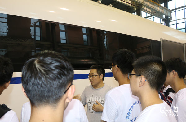 的大型地下工程实验室,大家都兴致盎然地与大型实验设备和模型合影留念,尤其是盾构机的实物模型,吸引了不少学生驻足留影。在参观了隧道实验室后,全体营员前往高速铁路线路工程教育部重点实验室参观,阳恩慧副教授重点为大家讲解高铁线路模型,深深地吸引了营员们的注意力。上午的最后一站是牵引动力国家重点实验室,作为交大最负盛名和最有特色的实验室之一,牵引实验室不但数次荣登新闻联播,还出过纪录片,当之无愧是营员们心中的“网红实验室”,大家一路都兴致盎然,牵引动力实验室的王思明老师带领大家依次有序参观,一一讲解各种实验设备,营员们将老师团团围住,多次提问,并纷纷拍照留念。